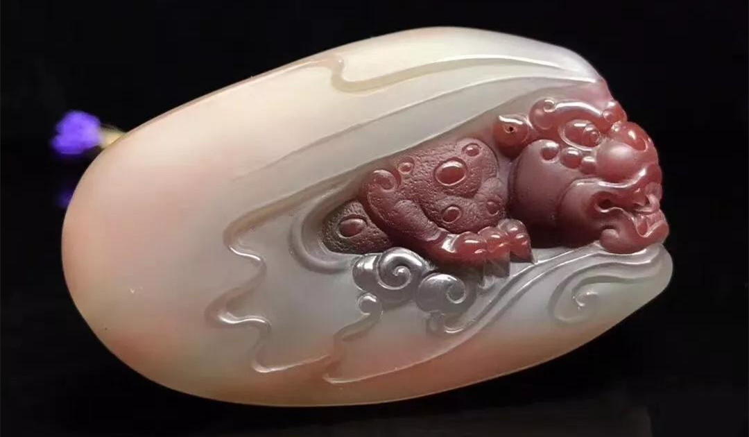 庵沟(安沟)紫绿玛瑙多为红心橙边或者红心肉红边。庵沟(安沟)紫绿玛瑙色彩由内至外,少数也有红色为心,黑色冰料紧随其后,白色居中,肉色或者橙黄色为边,比较容易区分,色彩边界比较明显,也有部分会有过渡色。在庵沟(安沟)紫绿玛瑙中,黑色冰料和白色是庵沟(安沟)紫绿玛瑙的一个特色,在其它矿口在绿玛瑙中,极少出现黑色,尤其是黑色冰料。而白色油润有佳,甚至有人将其称之为紫绿玛瑙中的和田玉。尤其是黑色冰料搭配红心,让庵沟(安沟)紫绿玛瑙更显神秘和耐看。庵沟(安沟)紫绿玛瑙雕刻成品,是不可多得的精品把件。