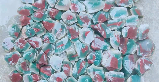 牛槽洼紫绿玛瑙矿料以红心绿边双色矿料为主,也有部分红心绿边带肉黄色皮的三色料。牛槽洼料主要特征是玉化程度高,色彩非常纯净,颜色交汇处边界分明。其中红色一般较为鲜艳浓重,绿色如翠、黄色则温润有油脂感。因此牛槽洼紫绿玛瑙原矿石色彩分明,颜色种类较少,料子质地纯净,因此雕刻难度较低,非常适合传统题材玉雕作品。很多玉石爱好者甚至是玉雕师往往不惜周折,寻求牛槽洼紫绿玛瑙极品原料,或做玉雕成品,或者原料收藏。