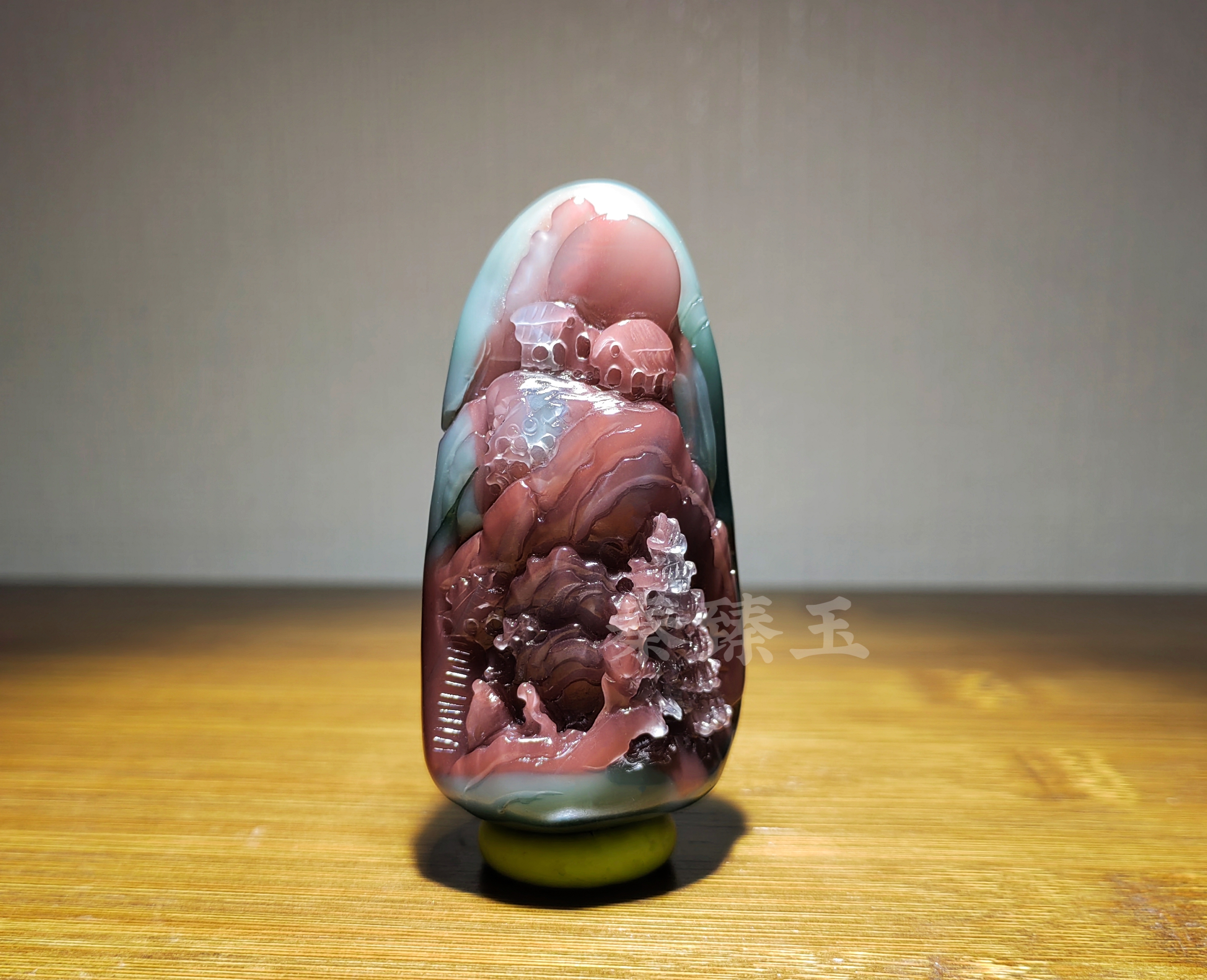 当我们跟随者玉雕师所刻画的线条,细细品味水润通透的玛瑙上的那些山水时,初看是一片清明的山水雅致,细看之下是绵延万里的江山,在方寸之间便能揽进大千美景,玉石我们的心境也会变得如天地板宽阔了。