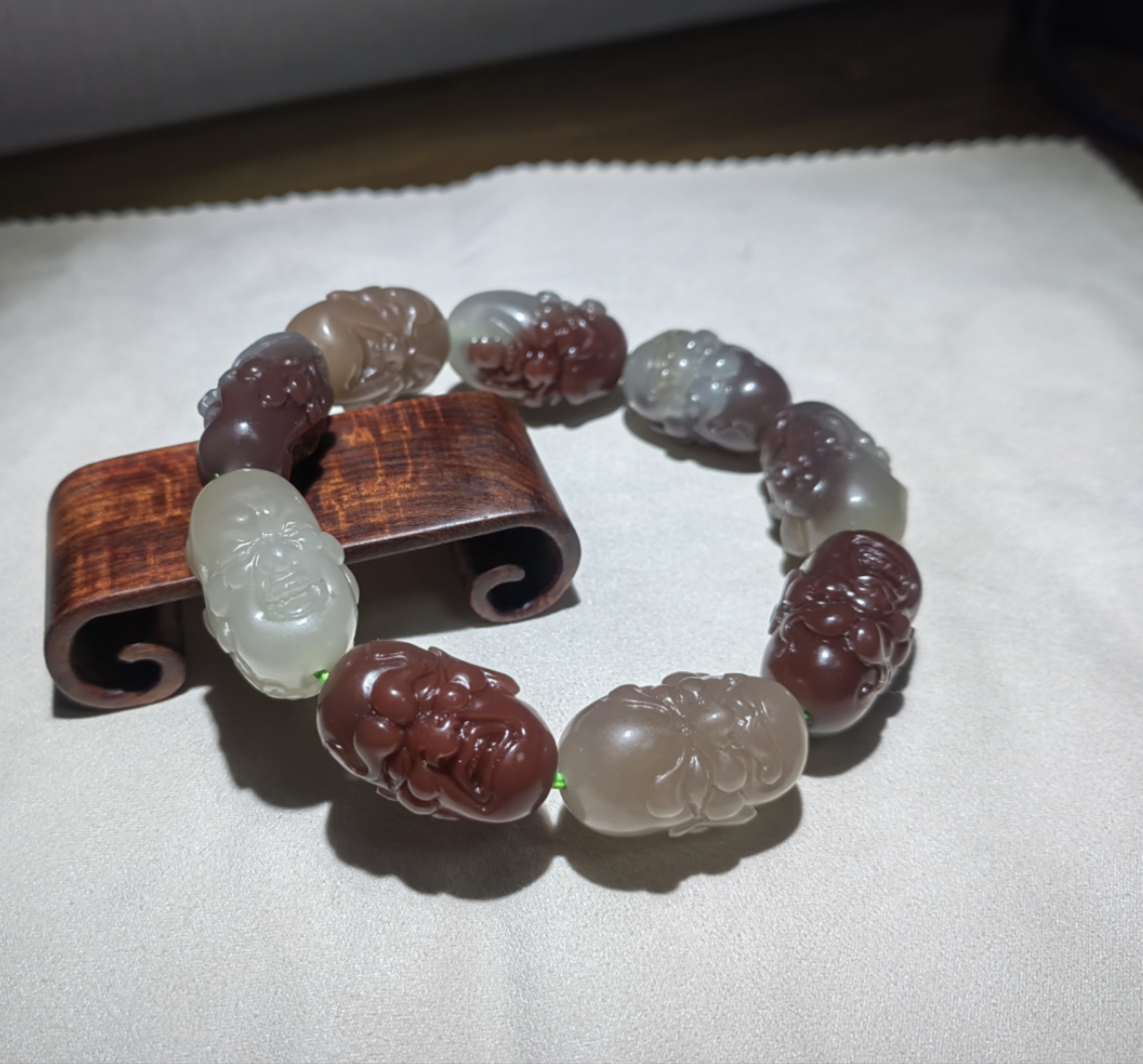 罗汉得证果位,超脱生死,得天下人供奉,六根清净,拥有金刚不坏之身,做为坚毅果敢、幸福如意的象征,能助人在危难之时逢凶化吉,驱灾解难,更是美好的心灵寄托。我们这串紫绿玛瑙罗汉造型表情多变,玉饰充满韵味,是有着美好寓意的。